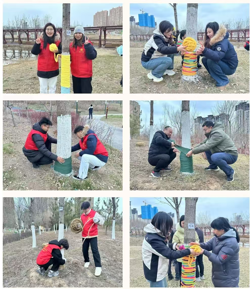 现场观摩结束后,全体党员及学生志愿者赴月湖公园开展“给大树穿棉衣”志愿活动。大家分组协作,严格遵循园林树木冬季养护技术规范,采用环保低成本防寒措施为树木“御寒”。经过共同努力,园区景观树全部披上“防寒战甲”,为树木安全越冬筑牢屏障。此次志愿活动将“护绿、爱绿”生态理念与党性教育成果转化为服务民生的实际行动,让主题党日活动更具温度与实效。