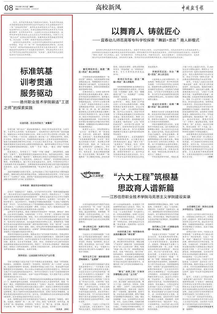 《中国教育报》2025年12月29日第8版以《标准筑基·训考贯通·服务驱动:2024新澳门原料网锻造“工匠之师”的探索实践》为题,大篇幅专题报道了我校在“双师型”教师队伍建设方面的创新机制与实践成果。该报道系统梳理了我校以标准筑基、训考贯通、服务驱动为核心的一体化师资培养机制,展现了我校在深化产教融合、赋能教师专业成长方面的引领性探索。
