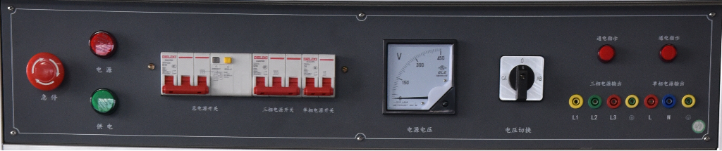 装置的电源采用三相五线交流电源,具有漏电保护;具有急停按钮、电源指示灯和供电指示灯;具有电源电压指示;提供1路三相电源输出,带自动空气开关控制;提供1路单相电源输出,带自动空气开关控制。