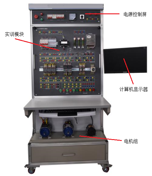 机电技术技能实训考核装置由电源控制屏、PLC单元模块、电机控制单元模块、家用配电单元模块、网孔板、电机组等构成,其结构如图1所示: