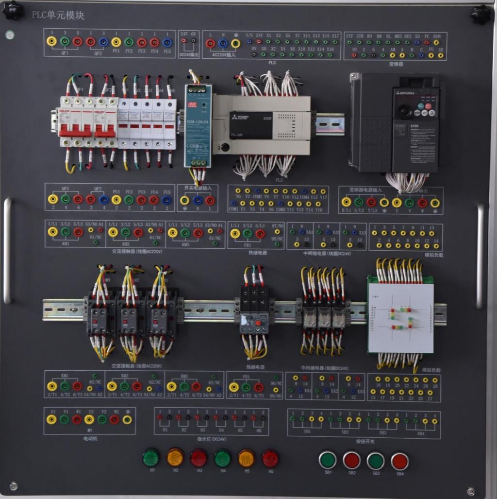 PLC单元模块包含断路器、熔断器、DC24V开关电源、三菱FX3U-32MR PLC、三菱FR-E740变频器、交流接触器、热继电器、中间继电器、可插拔式模拟负载模块、按钮开关、指示灯等电气元件,所有电气元件的引线全部转接到安全插孔上。挂箱内部具有自动智能巡线系统,可自动检测外部接线的正确性。