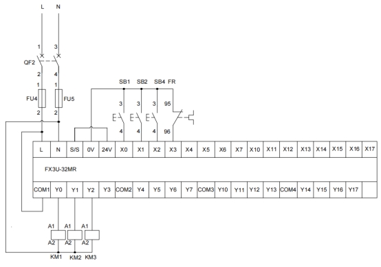 (3)电动机M1和M2运行3秒时间到,交流接触器KM3线圈得电并保持,出料传送带电动机M3起动,输送板材。