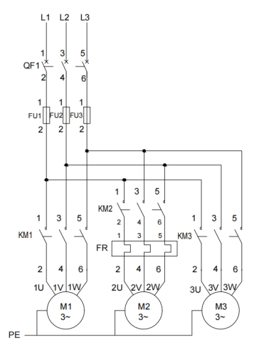 (8)任意时刻按下停止按钮SB2,交流接触器KM1、KM2、KM3线圈断电,电动机M1、M2、M3立即停止。